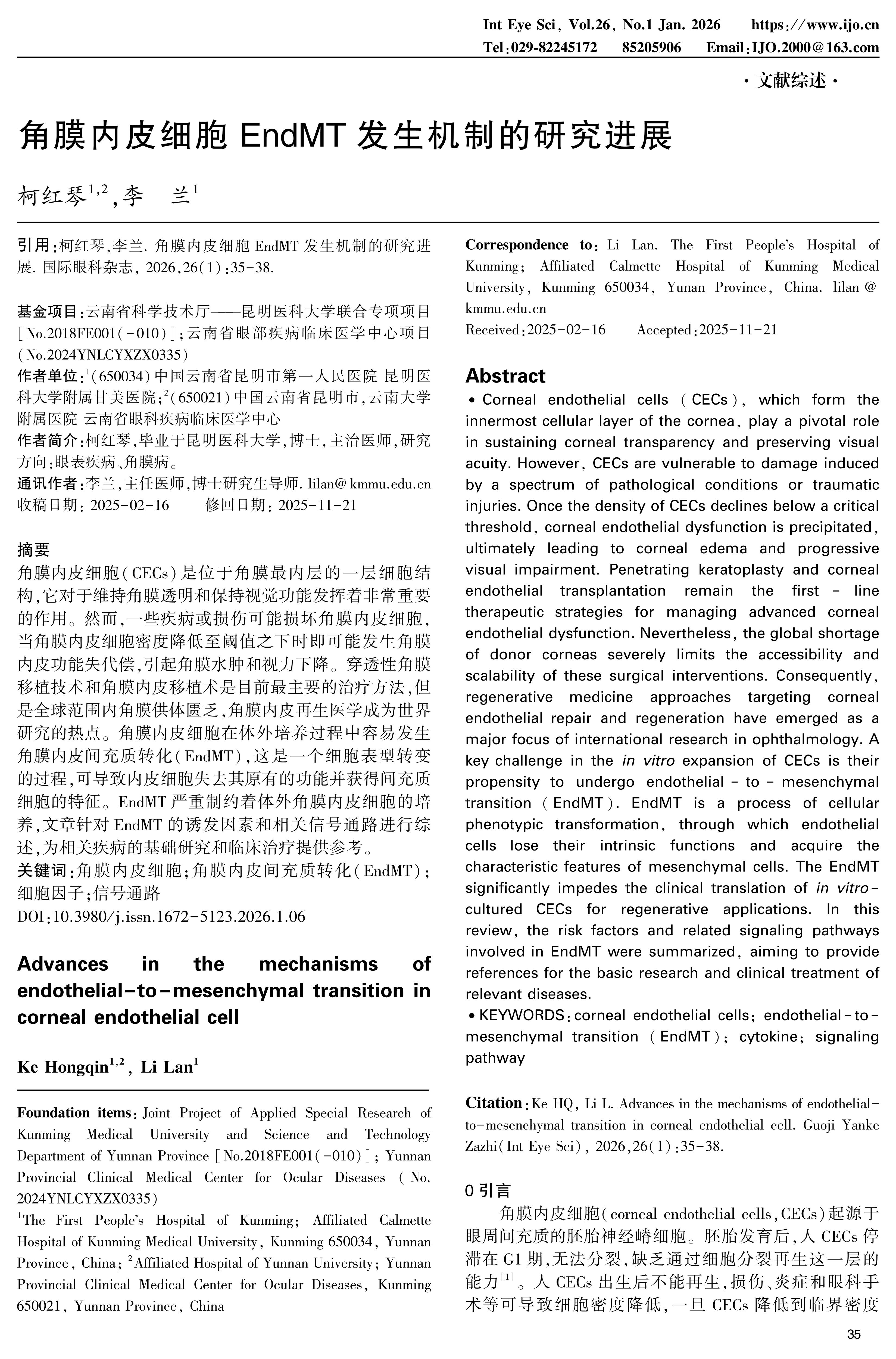 角膜内皮细胞(CECs)是位于角膜最内层的一层细胞结构,它对于维持角膜透明和保持视觉功能发挥着非常重要的作用。然而,一些疾病或损伤可能损坏角膜内皮细胞,当角膜内皮细胞密度降低至阈值之下时即可能发生角膜内皮功能失代偿,引起角膜水肿和视力下降。穿透性角膜移植技术和角膜内皮移植术是目前最主要的治疗方法,但是全球范围内角膜供体匮乏,角膜内皮再生医学成为世界研究的热点。角膜内皮细胞在体外培养过程中容易发生角膜内皮间充质转化(EndMT),这是一个细胞表型转变的过程,可导致内皮细胞失去其原有的功能并获得间充质细胞的特征。EndMT严重制约着体外角膜内皮细胞的培养,文章针对EndMT的诱发因素和相关信号通路进行综述,为相关疾病的基础研究和临床治疗提供参考。